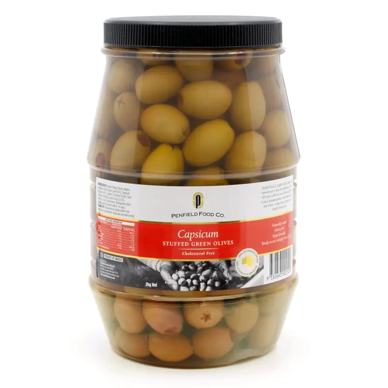 Penfield Food Co premium Greek Green Olives stuffed with sweet capsicum are bursting with flavour and ready to enjoy. Perfect for antipasto platters, cheese boards, salads, or as a vibrant addition to pasta dishes and pizzas. Delicious straight from the jar or lightly marinated with extra virgin olive oil and fresh herbs. A colourful, crowd-pleasing favourite for effortless entertaining.