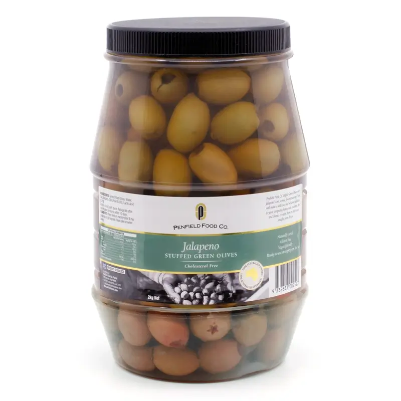 Penfield Food Co premium Greek Green Olives stuffed with spicy jalapeño offer a lively kick with every bite. Perfect for antipasto platters, cheese boards, salads, or adding a hint of heat to pasta dishes and pizzas. Enjoy straight from the jar or marinated with extra virgin olive oil and herbs. A bold, flavour-packed choice for entertaining with a little extra bite.